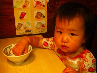 娘が結構食べるので大盛(¥100増し)でラーメンと広東麺を頼んでみました。坦々麺が売りらしいのですが・・・芝麻醤の色が見えないのでちょっと躊躇・・・。結局、夫はまずスタンダードで勝負!私は野菜たっぷりがいいので前回と同じく広東麺を☆